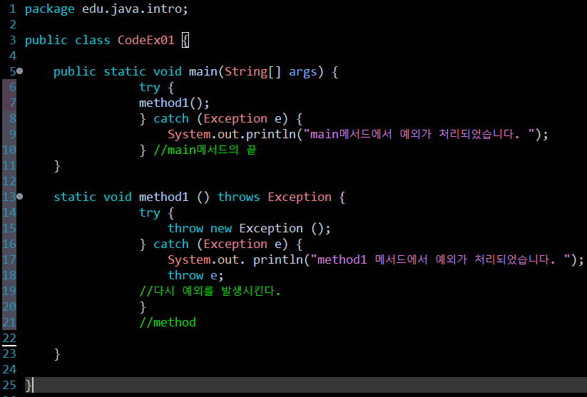 예외 되던지기란? 한 메서드에서 발생할 수 있는 예외가 여럿인 경우, 몇 개는 try-catch문을 통해서 메서드 내에서 자체적으로 처리하고, 그 나머지는 선언부에 지정하여 호출한 메서드에서 처리하도록 함으로써, 양쪽에서 나눠서 처리되도록 할 수 있다. 그리고 단 하나의 예외에 대해서도 예외가 발생한 메서드와 호출한 메서드, 양쪽에서 처리하도록 할 수 있다. 예외를 처리한 후에 인위적으로 다시 발생시키는 방법을 통해서 가능한데, 이것을 예외 되던지기(exception re-throwing)라고 한다! 먼저 예외가 발생할 가능성이 있는 메서드에서 try-catch문을 사용해서 예외를 처리해 주고 catch문에서 필요한 작업을 행한 후에 throw문을 사용해서 예외를 다시 발생시킨다. 다시 발생한 예외는 이..